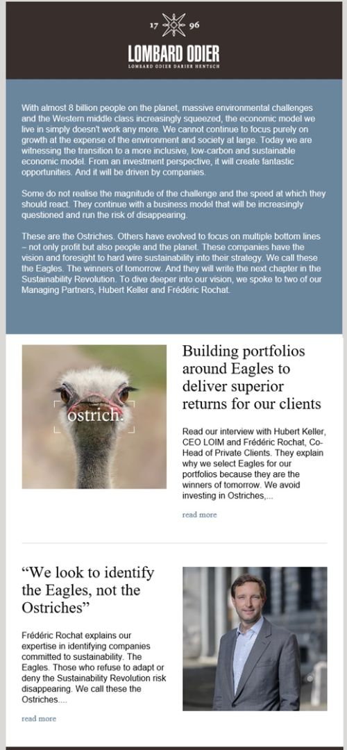 The insight is with “almost 8 billion people on the planet, massive environmental challenges and the Western middle class increasingly squeezed, the economic model we live in simply doesn't work any more.” And, some businesses do not realise the magnitude of the challenge and the speed at which they should react…and run the risk of disappearing. These are the Ostriches (for sticking their head in the sand). On the other side of the equation are the eagles who are positioning themselves for the opportunities ahead. The premise being Lombard Odier believes in finding the eagles to invest their clients money in. In addition to the insight paper and print Lombard Odier has also produced this ostriches or eagles video.